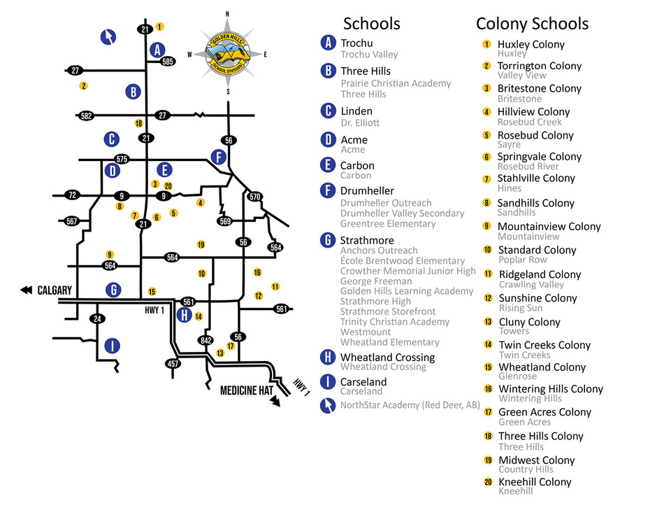Golden Hills School Division has 15 regular schools, 2 Christian alternative schools, 2 virtual schools (including a Christian alternative virtual program), 3 outreach schools, and 20 Hutterite schools. Golden Hills also has an international program with 300 students from 30 countries.